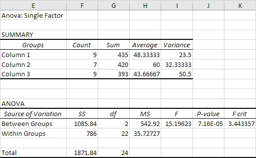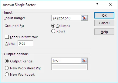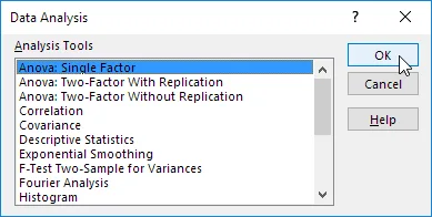 This example shows how to perform a one-way ANOVA in Excel. A one-way or single-factor ANOVA (Analysis of Variance) examines the null hypothesis that several population means do not differ from each other.