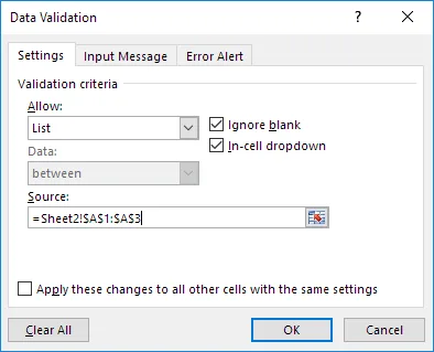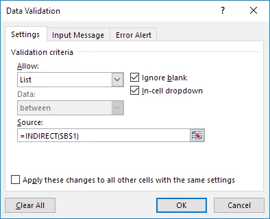9. In the Source box type =INDIRECT($B$1).