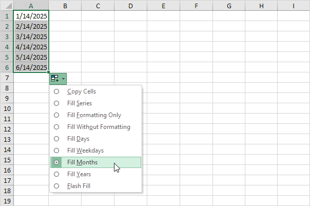 9. Autofill Date in Excel: Select cell A1 and type 1/14/2025.