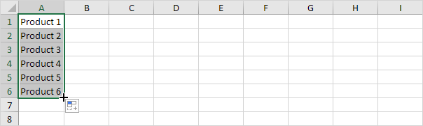 6. Select cell A1. Drag the tiny box in the bottom-right corner of cell A1. AutoFill will automatically fill in the rest of the product names.