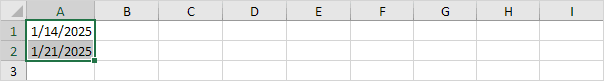12. Autofill weekly dates in ExcelIn your worksheet, type 1/14/2025 in cell A1 and 1/21/2025 in cell A2.