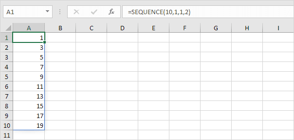 19. This example shows how to use the SEQUENCE function to create odd numbers. There are 10 rows and 1 column. The sequence starts at 1, and each following number goes up by 2.