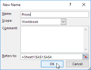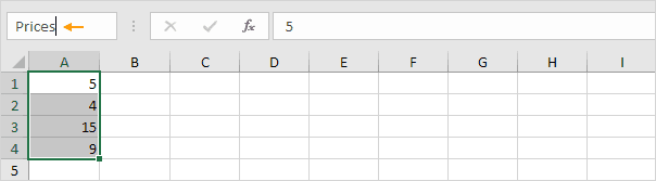 5. You are now able to use this named range in your formulas. For example, sum Prices.