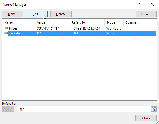 1. Click Name Manager in the Defined Names group on the Formulas tab.
