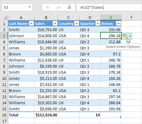 Note: Click AutoCorrect Options, choose Undo Calculated Column, and the formula will be added only to cell E2.