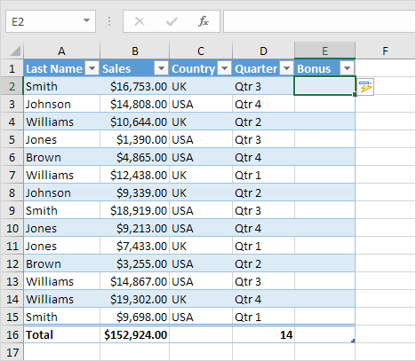 1. Select E1, type Bonus, and hit Enter. Excel automatically formats the column for you.