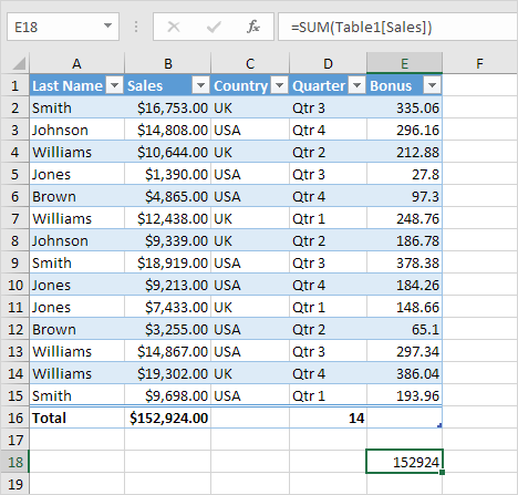 Explanation: This formula sums all numbers in the Sales column. Excel will generate a list of structured references when you type =SUM(Table1[. Adding or deleting records will automatically update this formula.